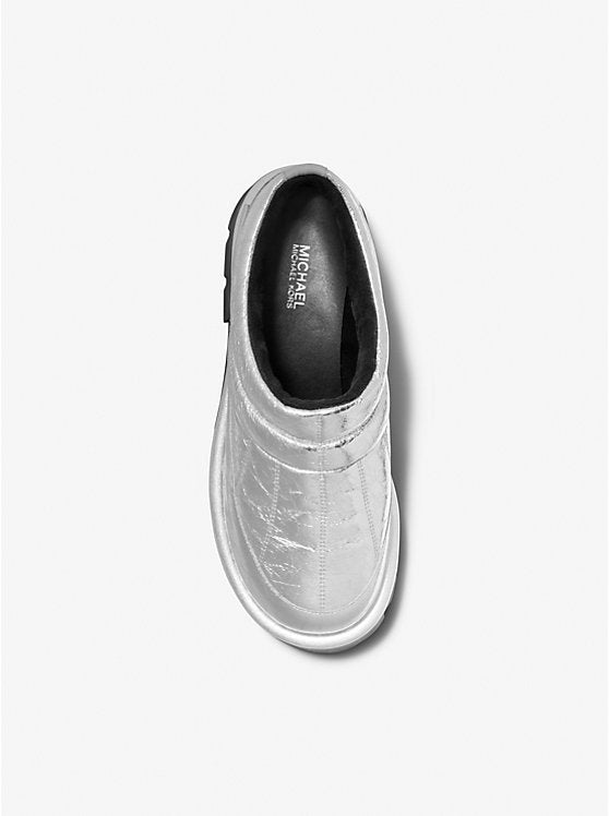 These snow-boot-inspired slippers bring high-fashion flair to your cozy indoor or outdoor lounging. The crackled metallic leather and quilted design offer a luxe touch, while the water-resistant finish keeps things practical. With a plush lining and a sturdy lug sole, they are the perfect mix of comfort and edge. Slip them on with your favorite wool socks and denim for an instantly elevated look.