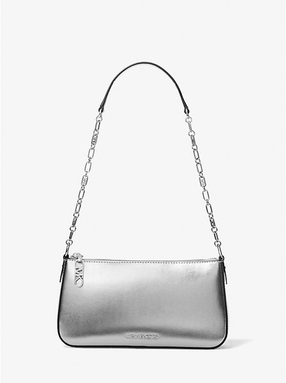Shine bright like a diamond with this metallic leather pochette that turns every sidewalk into a runway. Its sleek silver-tone chain strap adds just the right amount of glitz to your party dress or favorite denim. This compact beauty effortlessly carries your phone, sunglasses, and cardholder while keeping you looking effortlessly chic. Crafted from premium leather, it’s the flashy companion your wardrobe has been begging for.