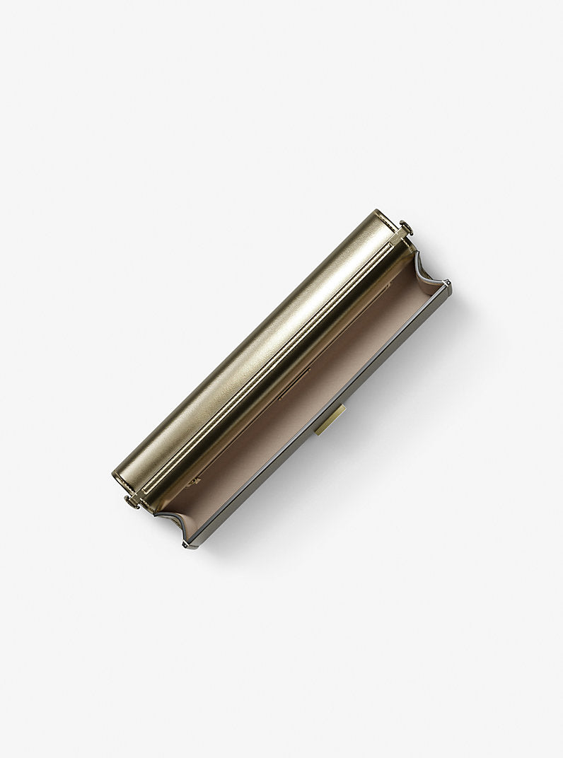 Rock the night away with this shimmering metallic leather bag that doubles as a clutch and a shoulder companion. Its structured pale gold body and glitzy hardware make it the perfect partner for your most fabulous outfits. Stash your party secrets in the secure interior zip pocket while the snap closure keeps everything under wraps. Swing it by the elegant chain strap or grab it by the handle to keep your style game strong.