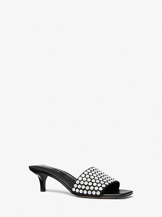 These chic sandals feature a sleek kitten-heel silhouette that effortlessly transitions from day to night. Adorned with gleaming studs on a smooth exterior, they offer just the right amount of glamour for any outfit. The slip-on design and manageable 2-inch heel make them as comfortable as they are stylish. Step out in confidence with this versatile and sophisticated wardrobe essential.