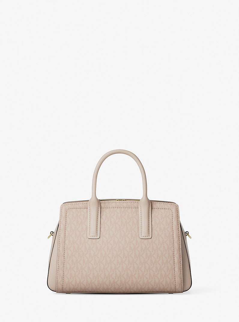 This sophisticated satchel features a structured silhouette with soft rounded gussets for a timeless look. Crafted from iconic logo-print canvas with premium leather trim, it keeps your essentials organized in multiple interior pockets. A detachable crossbody strap lets you switch from a chic hand-carry to a breezy hands-free style. Secure your treasures with the full-zip closure and let the gold-tone hardware add a dash of luxury to your daily trot.