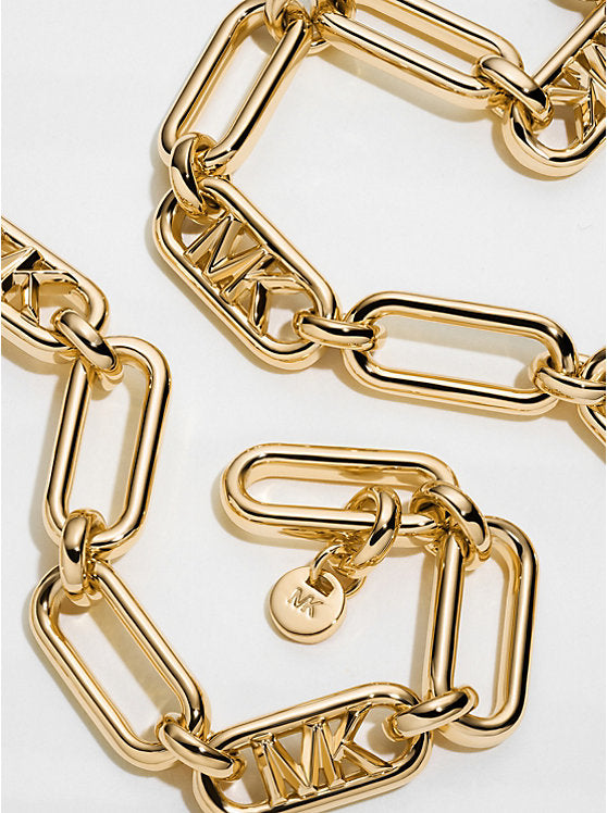 Add some tough-chic sparkle to your look with this high-shine chain link necklace that transitions perfectly from day to night. Crafted from brass and dipped in 14K gold or platinum plating, it features those iconic MK initials for a signature touch. It's the ultimate layering piece to showcase your personal style with a bit of a playful wink. Just remember to keep it dry and cozy in its pouch to keep that shine bright!