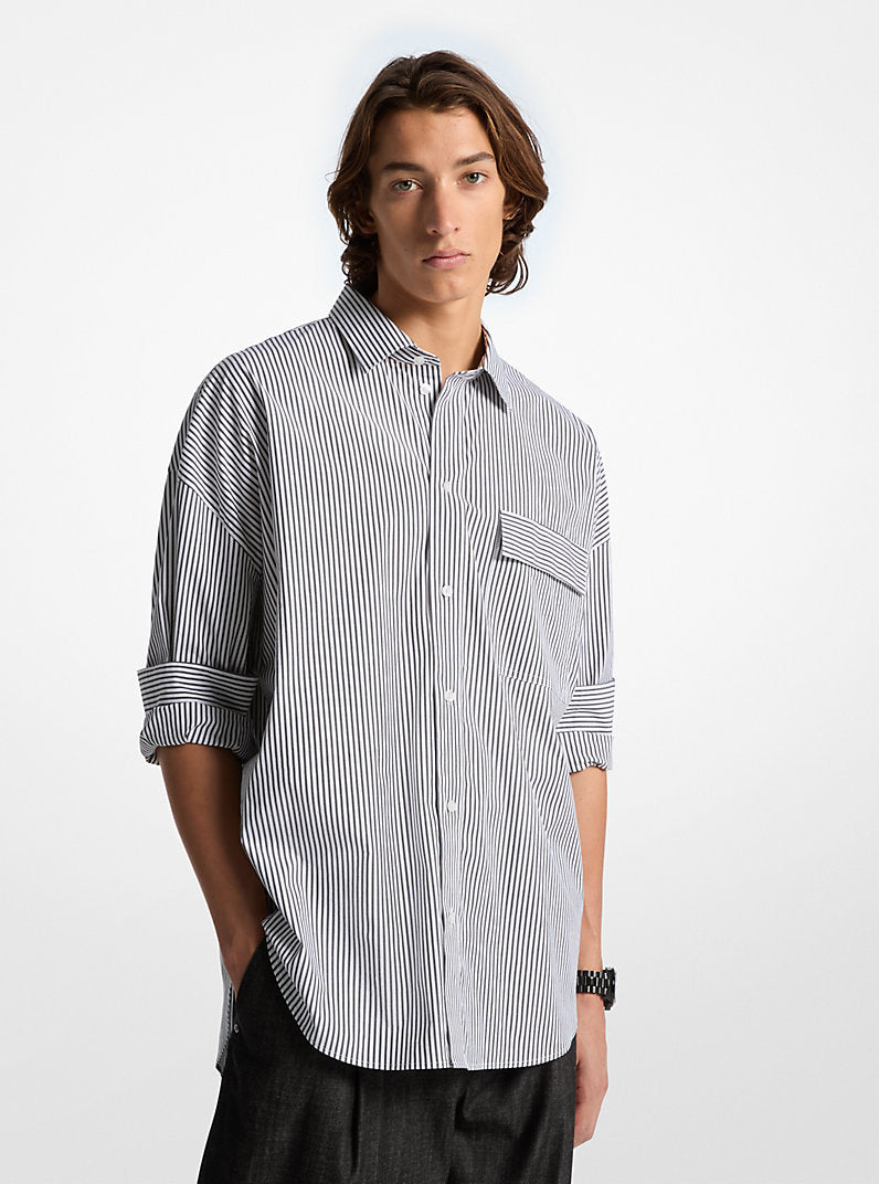 This breezy button-up brings a relaxed edge to your wardrobe with its cool oversized silhouette and classic stripes. Crafted from organic stretch cotton poplin, it features stylish drop shoulders and cozy knuckle-grazing cuffs for all-day comfort. Whether you're pairing it with sleek trousers or your favorite denim, this versatile shirt is a total mood. It's the perfect mix of refined style and laid-back vibes for any occasion.