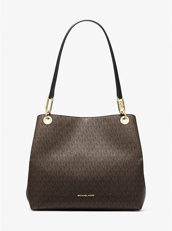This polished tote is your new best friend for busy days on the go. Flaunting the iconic signature logo print, it keeps your essentials organized with plenty of clever pockets. Gleaming gold-tone hardware and a chic chain-link handle add just the right amount of sparkle. It even has protective feet to keep it looking fabulous wherever you set it down.