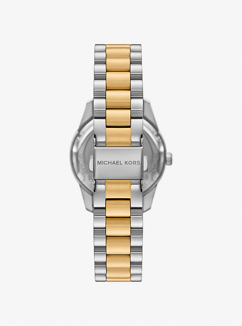 Add some serious sparkle to your step with this dazzling pavé-bezel timepiece! Its moody black dial and gold-tone Roman numerals make a bold statement that plays well with any outfit. Wrapped in a chic two-tone stainless steel bracelet, this watch is your new favorite plus-one for every occasion. It’s high-fashion meets high-function, keeping you on time and totally on trend!
