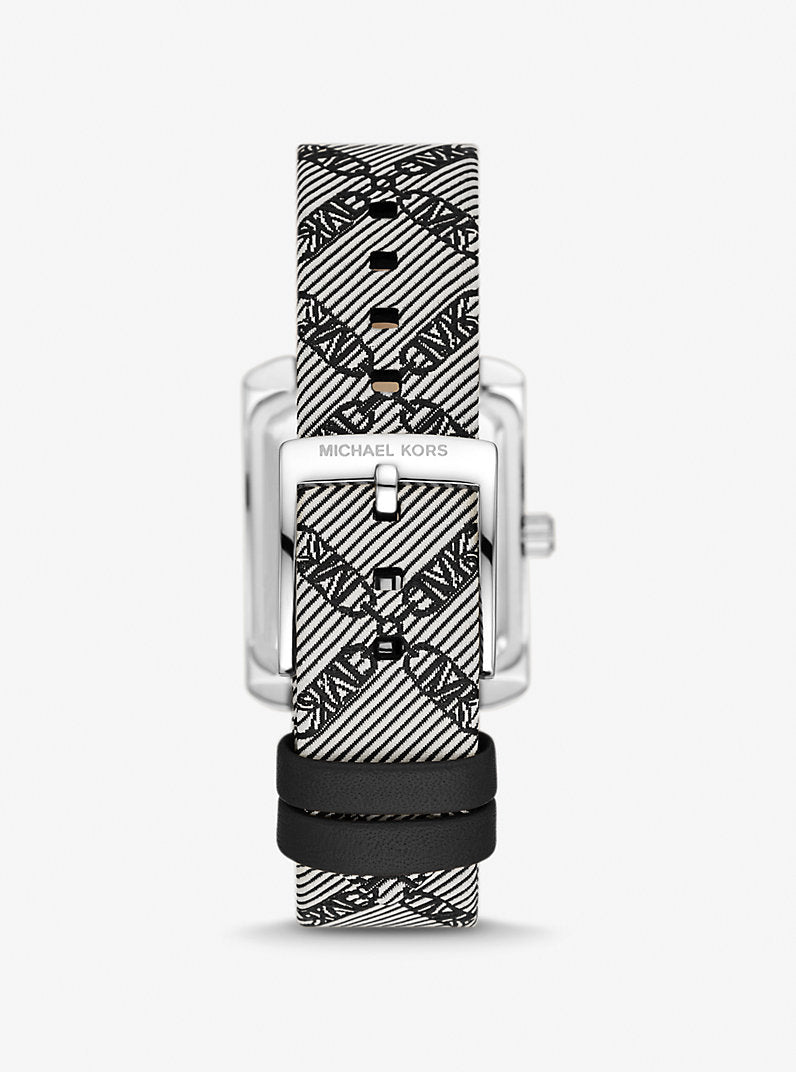 Keep your style on track with this precious Emery timepiece featuring a sleek silver-tone bezel and noir dial. Classic Roman numeral markers meet a modern Empire logo jacquard strap for a look that pops. This mini watch is perfect for making a grand statement from morning meetings to late-night dancing. Its stainless steel build and water resistance ensure you stay chic no matter the weather.