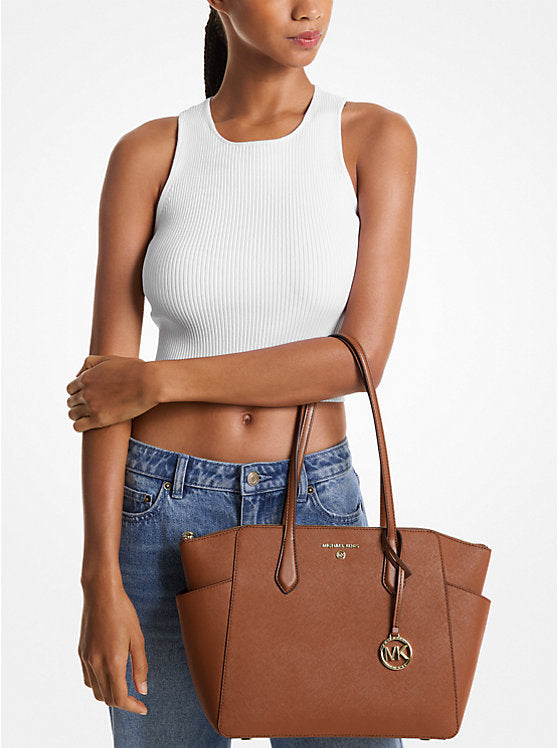 Structured Saffiano leather keeps shape while the zip-top and organized interior pockets hold daily essentials with ease. Slender shoulder straps and side slip pockets make city commutes and errands effortless, while gold‑tone MK hardware adds a polished accent. Quilted polyester lining and a secure zip closure ensure contents stay tidy without fuss.