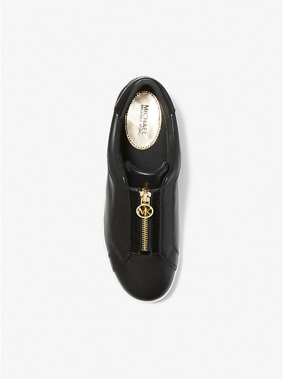 Zip into effortless style with these sleek leather sneakers featuring a modern front-fastening detail. The low-top silhouette and cushioned insoles ensure your feet stay happy all day long. Durable rubber soles provide excellent grip for strutting through city streets with total confidence. Showcase the eye-catching glossy back panel with your favorite cropped denim.