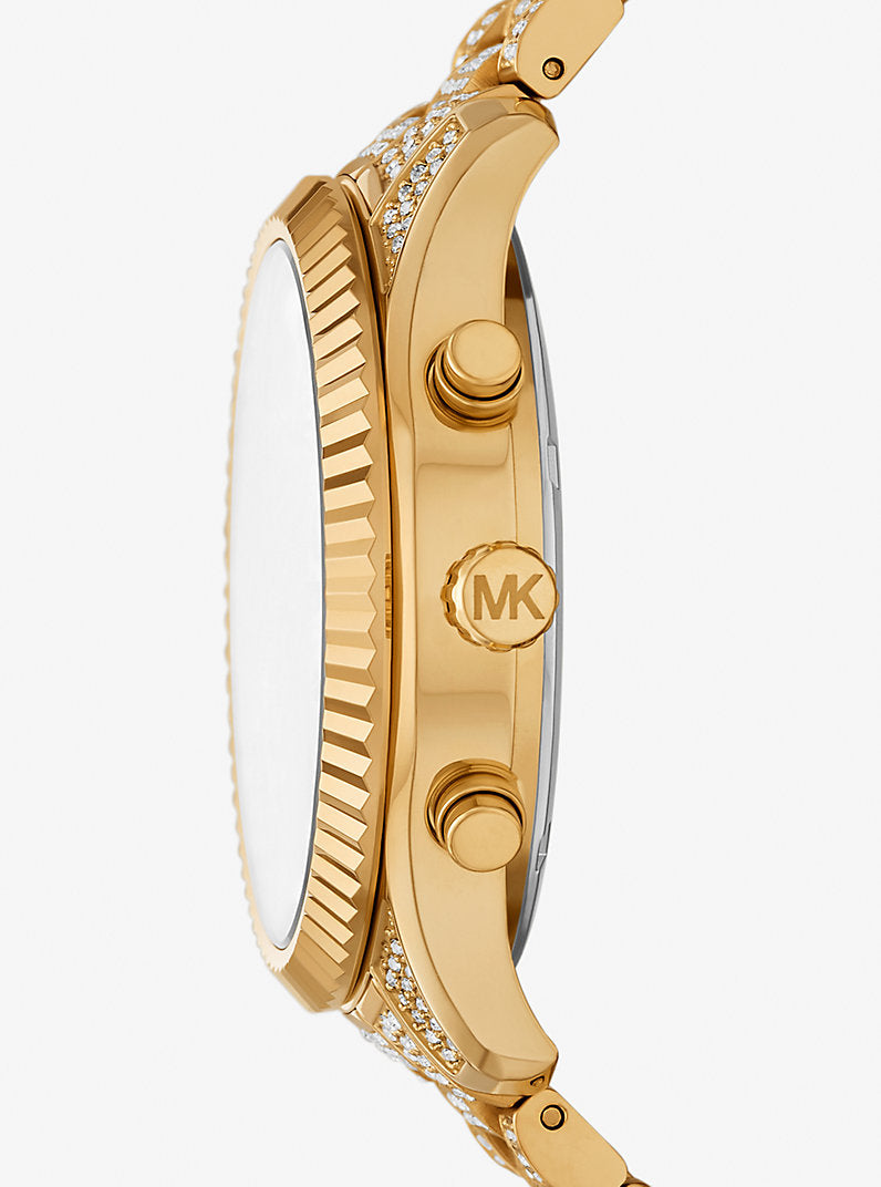 This timepiece turns every flick of the wrist into a dazzling light show with its allover pavé crystal finish. The bold gold-tone stainless steel design offers a classic silhouette that commands attention in any room. Featuring a beveled topring and reliable chronograph movement, it blends high-fashion glamour with everyday functionality. It’s the ultimate arm candy for anyone who believes there’s no such thing as too much sparkle.